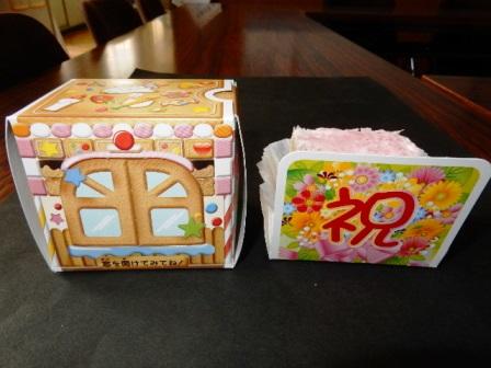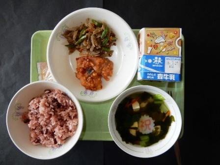 赤飯、鶏肉の金山寺みそ焼き、きんぴらごぼう、お祝いすまし汁、お祝いケーキ、牛乳です。