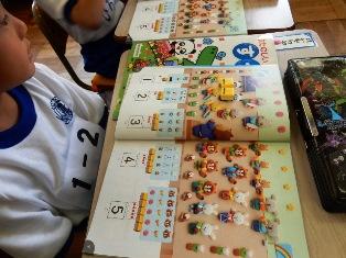 ブロック2こ、シールが2つ、数字の2のように、ブロックと