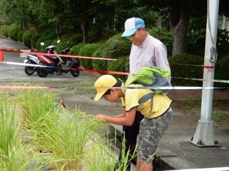 プールに入りに来た5年生の児童が稲穂を見ながら応援団の方と話しています。
