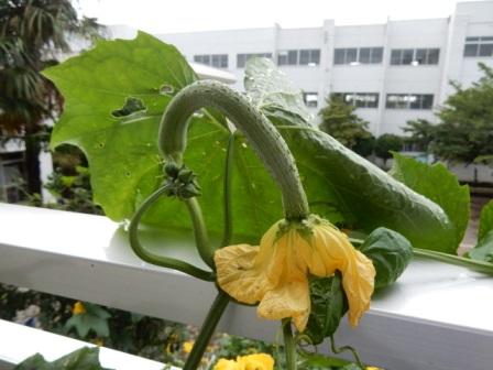子どもたちが育てているヘチマが2年生の教室のベランダまできて実を付けています。