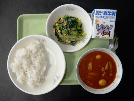 ごはん、卵カレールー、小松菜と春雨のソテー、牛乳です。