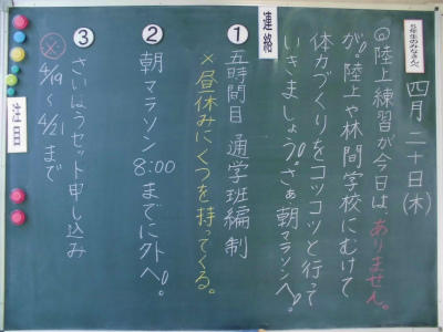 5年生の廊下に、先生から子どもへのメッセージが書かれている小黒板です。
