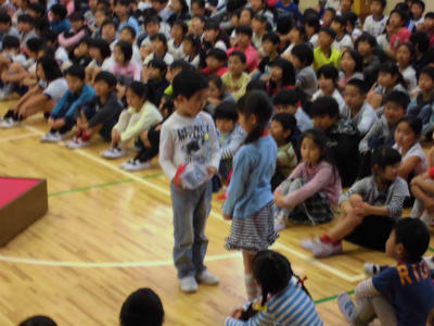 全校で心を一つにして、校歌を歌いました。1年生も上手に歌っていました。