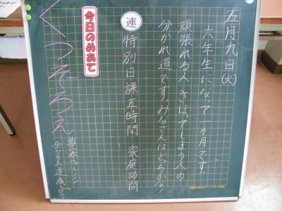 4・5・6年生の子どもは、廊下の黒板に書いてある教師からの提案を受けて、1日の見通しを持ち、頑張る気持ちをつくっています。
