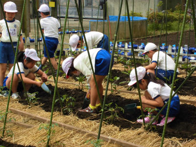 2年生は、野菜の育ち具合を観察しています。先日、野菜の先生に教えていただいたことを活かしながら、お世話できているでしょうか…