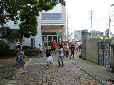朝から全力ダッシュのマラソンと朝マラソンの後、校庭から昇降口に戻る子どもたちの姿です。校舎とフェンスの狭い場所も、安全に歩いて帰ってくるので安心です。