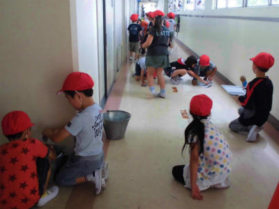 廊下掃除の様子です。水拭き、ほうきなどいろいろな道具で、きれいにしてくれています。
