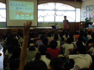 6年生:養護教諭から歯についての勉強会が行われました。磨いたはずなのに・・・。