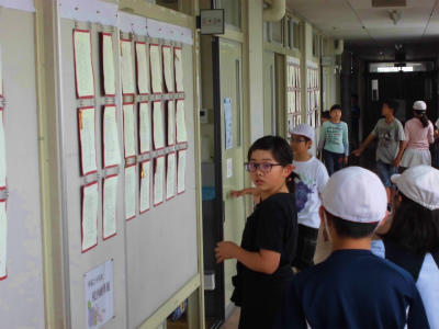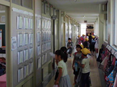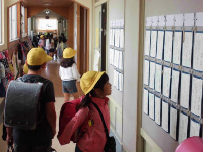 各学年で、硬筆展の発表が張り出されました。みんな興味津々。やったあ!、きれい!などの声があがっていました。