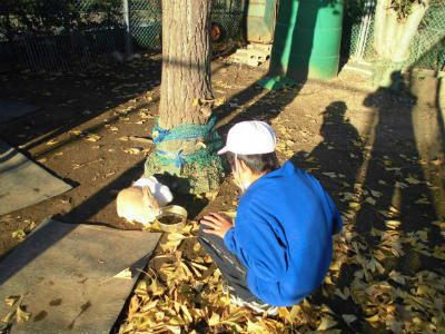 2羽のうさぎが仲良くえさを食べています。外に出ているので、飼育委員会以外の児童も嬉しそうです。
