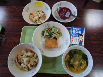 五目炊き込みごはん、牛乳、いかの竜田揚げ、小松菜のおひたし、みそ汁