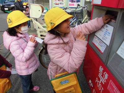 1年生の子どもたちが、自分で書いた葉書をポストに投函しに行きました。豊春小の近くには郵便局があるので、便利です。