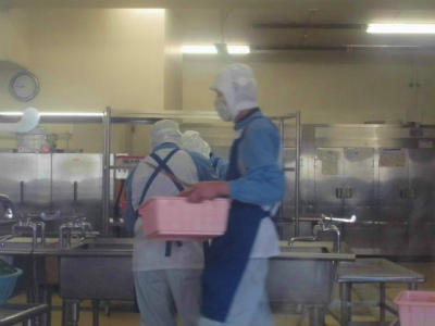 調理員さん、いつも美味しい給食をありがとうございます。給食室は、朝早くからとても忙しそうでした。ちょうど良い写真が撮れてカメラマンも嬉しいです。