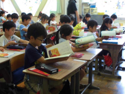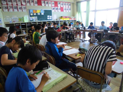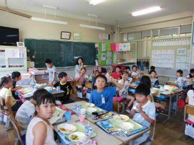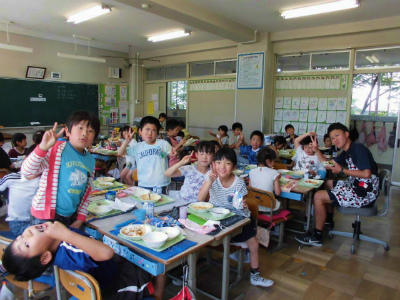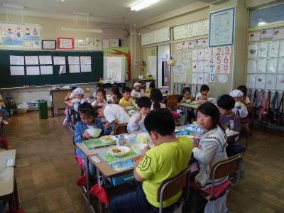2年生の教室から、笑顔の子どもたちです。給食は学校一番の楽しみに入りそうです。