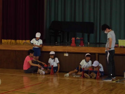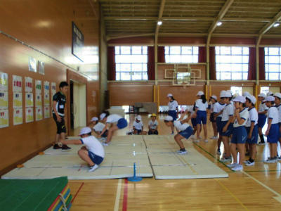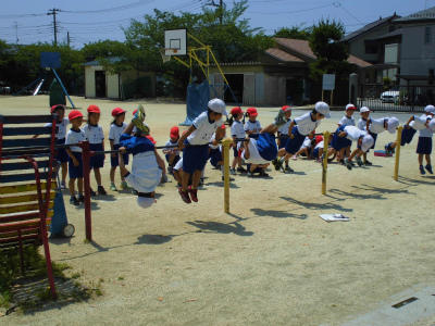 1年体育:鉄棒、前回りして、真っ直ぐにおりよう!できたかな?