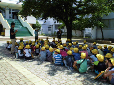 まち探検から帰ってきた2年生も、中庭で地震が発生した場合の行動の仕方について話を聞いています。
