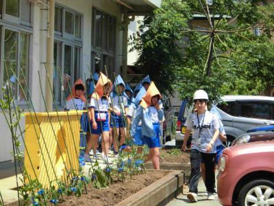 落ち着いて避難訓練での行動ができる豊春の子どもたちです。
