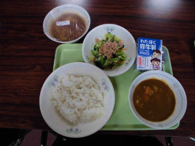 本日の献立 麦ごはん、ハヤシライスルウ、牛乳、ツナサラダ