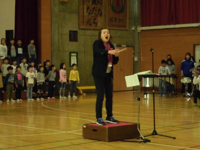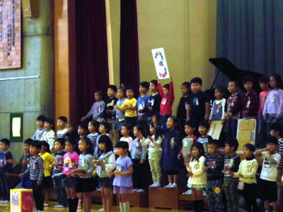 音楽朝会 ビリーブの合唱と1年生の発表「だれにだってお誕生日」