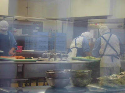 朝の給食室では、多くの調理員さんが野菜を刻んでいました。只今の時刻8時30分です。