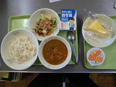 麦ご飯 牛乳 小江戸カレー ツナサラダ {ケーキ オレンジゼリー}