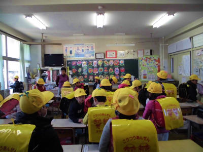 木曜日は1年生だけ5時間授業の後に帰ります。黒板には手作りの花が咲いています。