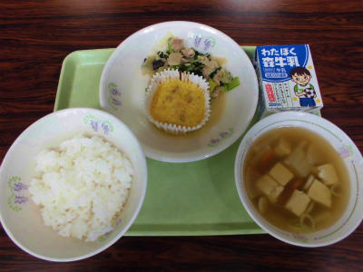 きょうの献立 ごはん、牛乳、和風卵焼き、鶏肉とねぎの炒め物、けんちん汁