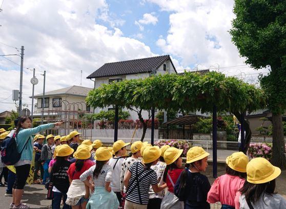 2年生 まち探検 先生の指さす方向をみんなで見ています。素敵なことが見つかった