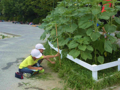 1年生 生活科 アサガオの世話 ツルがだいぶ伸びてきました。支柱を立てています。