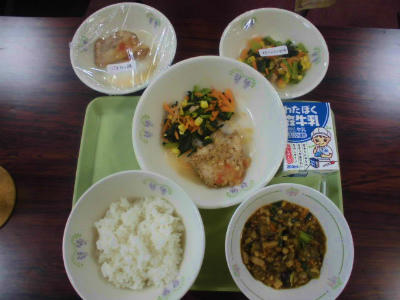 ごはん、牛乳、とり肉の香味ドレッシング、桜エビと野菜の炒め物、マーボーなす