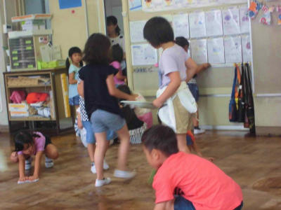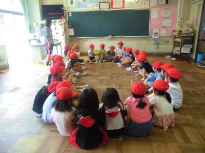 夏休みの生活について、お話を聞きました。火遊びはしないこと、水の事故に注意すること、不審者に注意すること、校外での過ごし方のルールを守ることについて、「4つの車にお世話にならないように…出合わないように…。」と先生が話したので、イメージを持ちながら聞くことができました。