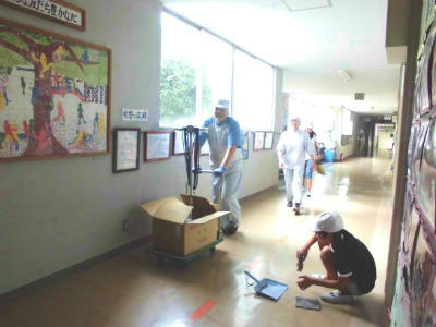 学期末の大掃除。3年生はまず、机を廊下に出しています。