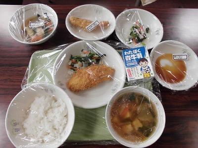 本日の給食は、ごはん、牛乳、鮭の雑殻揚げ、青菜とかんぴょうの和え物、ピリ辛みそ汁でした。アレルギーは、卵、乳製品、ごまでした。みそ汁が、ほんのりトウガラシの風味があり食べた後に風味が残る感じでとてもおいしかったです。
