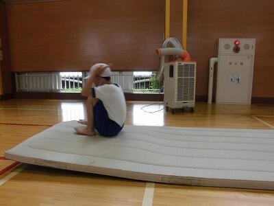 【4年生 体育】後転を習得しやすいように場の工夫をしています。また、熱中症防止対策で、スポットクーラーを設