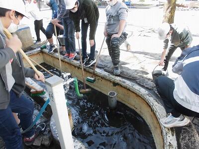 【6年生 奉仕作業】石灰小屋のペンキ塗りや、校庭の側溝掃除、中庭の池の掃除をしました。