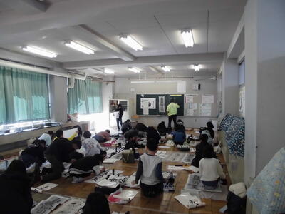 6年生の書きぞめの学習です。「自然の美」という字を画仙紙に書きます。一つ一つの字はもちろんのこと、漢字とひらがなの大きさのバランスなど気を付けることがたくさんあります。競書会に向けて集中して取り組んでいます。