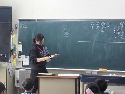 学校応援団の方に来ていただき、ジャガイモの植え方について詳しく説明していただきました。