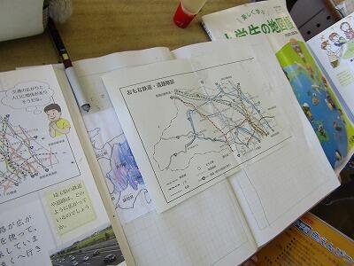 主な鉄道や道路、大きな川の流れについて地図に書き入れながら埼玉の地形の特徴を考えます。