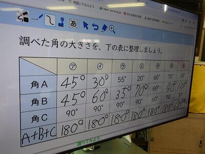 分度器を使っていろいろな三角形の角の大きさを調べます。