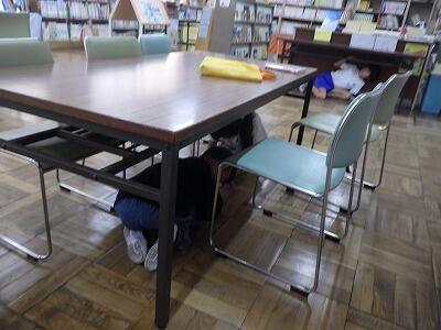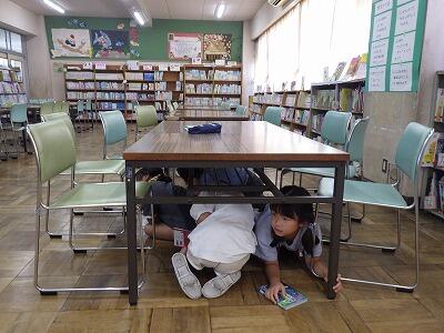 シェイクアウト訓練の放送が流れると、素早く机の下に身を隠しました。