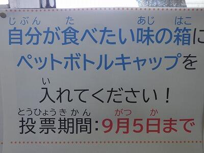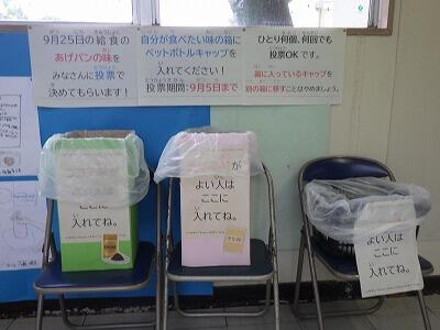 自分が食べたい味(ココア・きな粉・シュガー)の箱にペットボトルキャップで投票します。