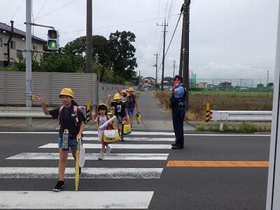手を上げて横断歩道を渡ります。
