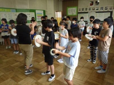 音楽に合わせ、タンバリンと鈴を鳴らしました。
