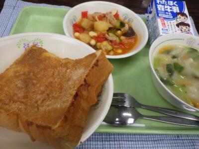 今日の給食は、ラタトゥイユ、マカロニスープ、きなこシュガートーストです。