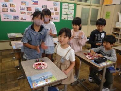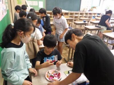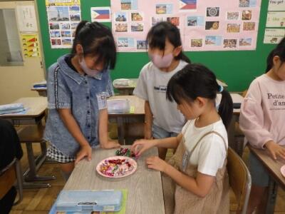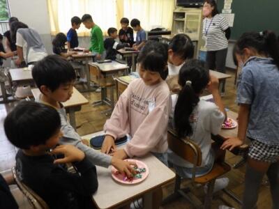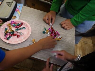 先生から英語で言われた数に合わせてあめをつかみ取りします。