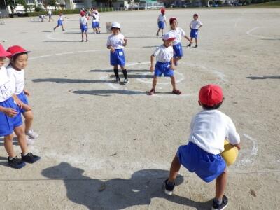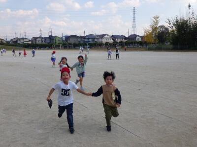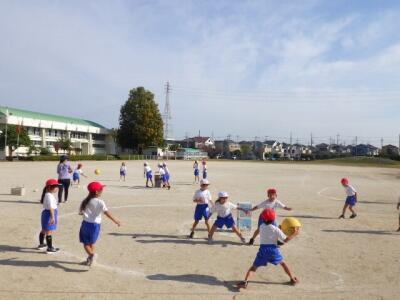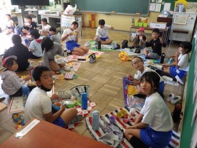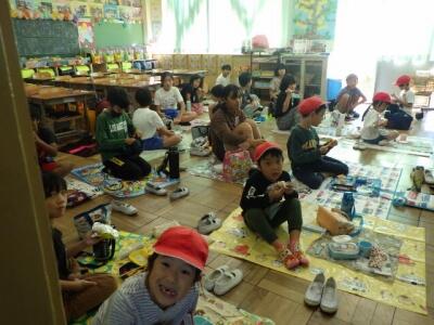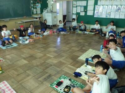 カラフルなレジャーシートの上で、違う学年の子たちと交流します。
