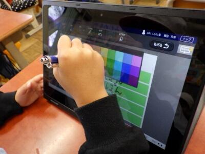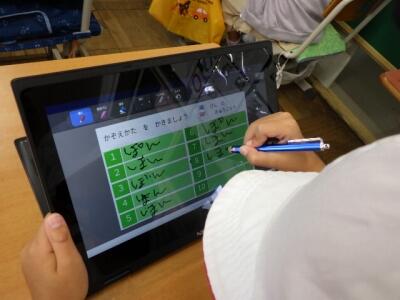 デジタル教科書から聞こえる音声に耳を傾けています。