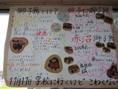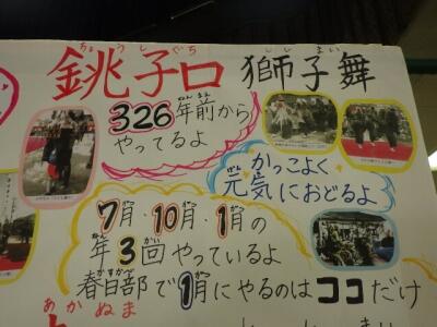 11月11日(土)の開校150周年記念式典の後、豊野小の体育館で銚子口と赤沼の獅子舞鑑賞会を行う予定です。