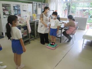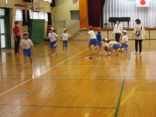 立ち幅跳びや鉄棒、紅白玉投げなどを交代で行います。