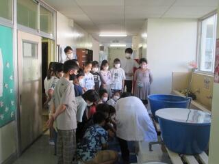 休み時間に実施し、それぞれの場所で自分の身を守る行動をとりました。